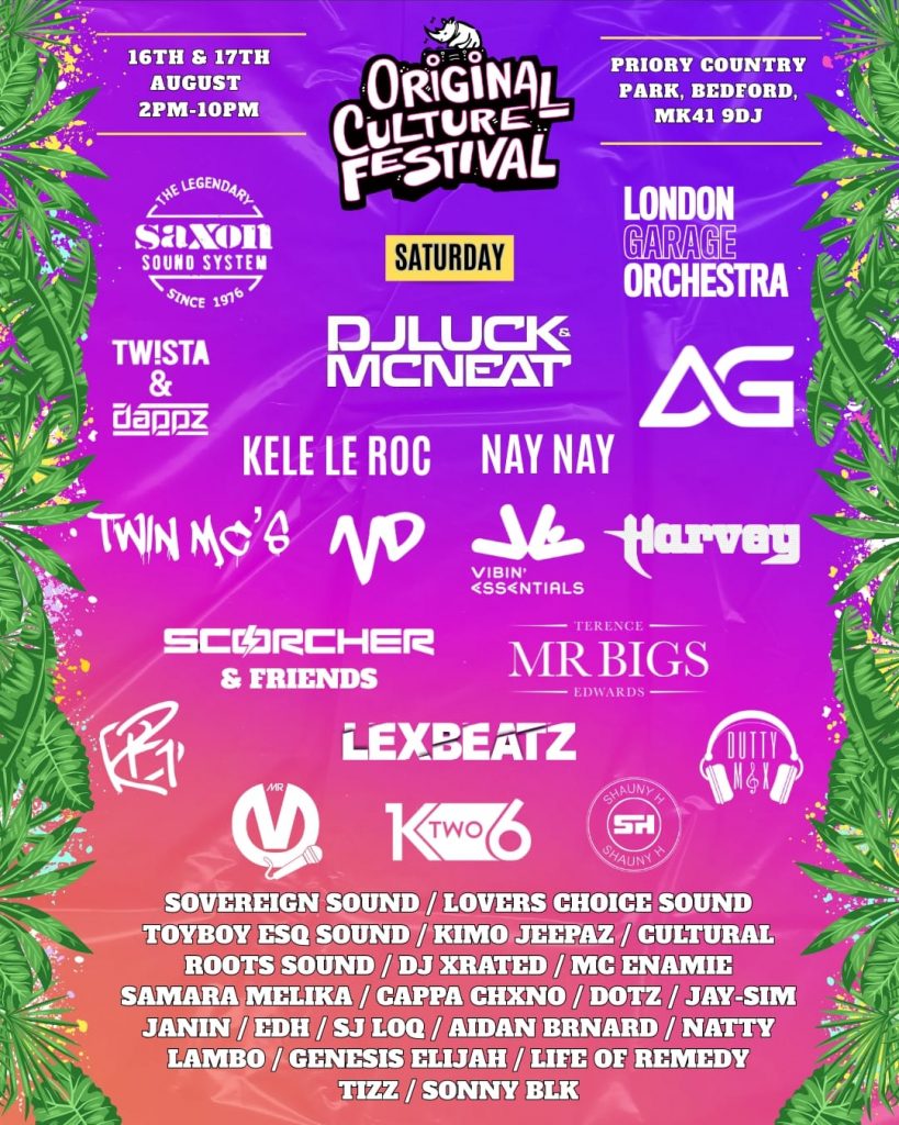 Saturday 16th August will see the return of fan favourites from previous events on both the main stage & the Reggae Matters Stage & new acts to bring you maximum energy. From Reggae to Garage, House to RnB, Jungle to hip hop. Prepare for us to take you on a journey through the Original Cultures of Music.